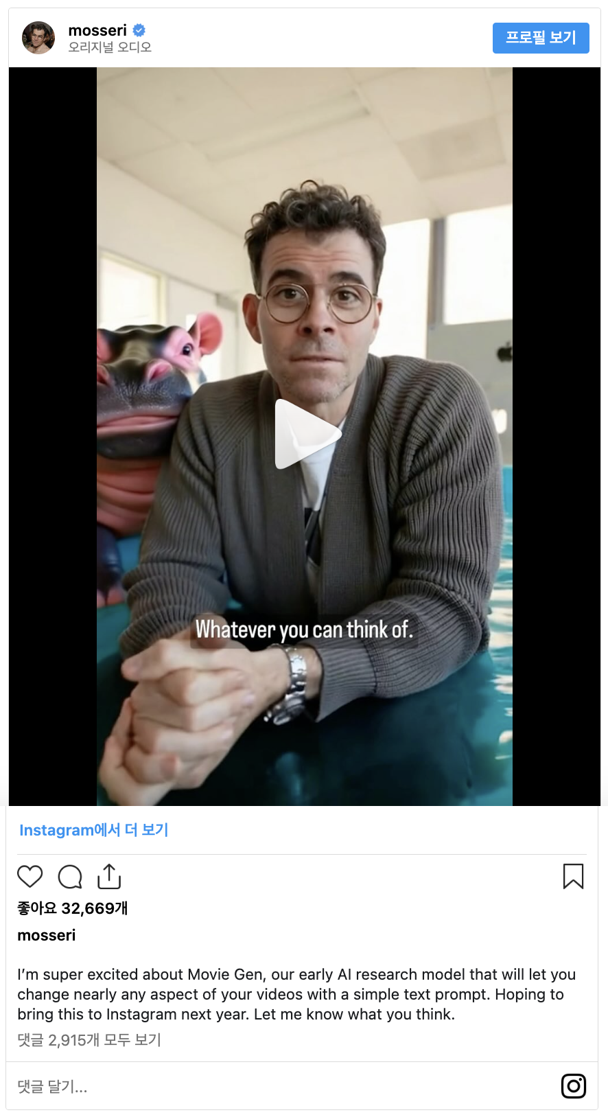 인스타그램이 메타의 AI 동영상 생성 모델 '무비젠(Moviegen)'을 활용한 티저 영상을 공개하며, 개인화된 동영상 제작의 새로운 장을 열고 있습니다. 무비젠은 사용자의 프로필 사진과 간단한 텍스트 프롬프트만으로 HD 동영상을 생성할 수 있는 혁신적인 AI 도구로, 내년 중 인스타그램에 공식 도입될 예정입니다.