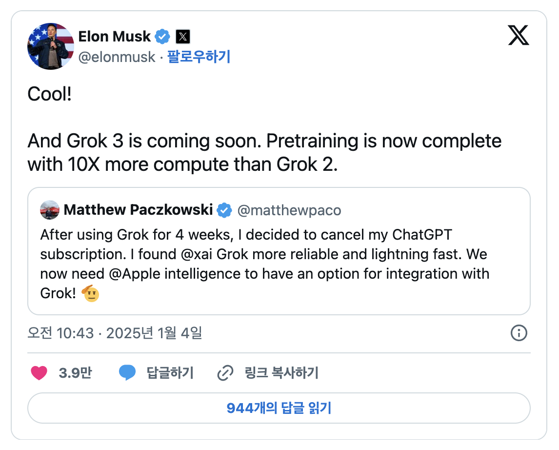 머스크의 발표처럼 그록 3가 기대를 뛰어넘는 성능을 보인다면, AI 기술 경쟁은 더욱 가속화될 것입니다.