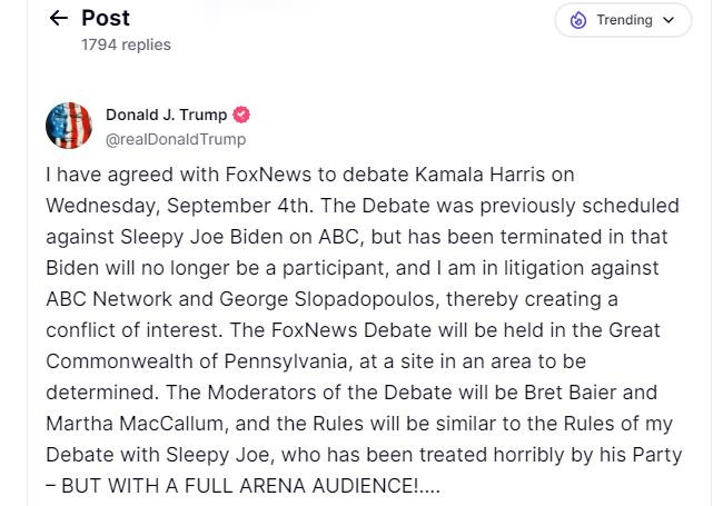 트럼프 전 대통령은 내달 4일 예정된 토론이 대선 조기투표가 시작되는 9월 6일 직전에 열리는 만큼, 매우 적절한 시점이라고 강조했습니다. 또한, 바이든 대통령이 재선 포기를 선언하기 전에 ABC 방송 주최로 예정된 9월 10일 TV 토론은 바이든 대통령이 더 이상 후보가 아니고, 트럼프 본인이 ABC 방송과 소송 중이어서 이해상충 문제로 취소되었다고 주장했습니다.