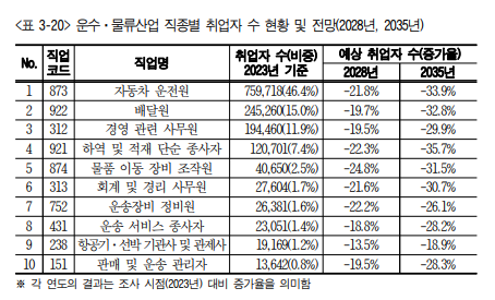 운수물류업 역시 디지털 전환의 영향을 크게 받을 것으로 예상됩니다. 조사에 따르면, 운수물류업에서 자율주행 기술 도입 비율이 9.0%로 나타나, 운송업의 디지털 전환이 활발히 이루어지고 있음을 보여줍니다. 운수물류업에서는 하역 및 적재 관련 단순 업무 종사자의 고용이 10년 내 35.7% 감소할 것으로 전망됩니다.